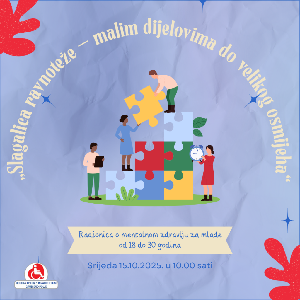 Pod nazivom „Slagalica ravnoteže – malim dijelovima do velikog osmijeha“, radionica je mladima pružila priliku da na kreativan i opušten način istraže što sve doprinosi dobrom mentalnom zdravlju. Kroz igru, razgovor i zajedničke aktivnosti, sudionici su prepoznavali male, ali važne izvore ravnoteže – poput sna, kretanja, druženja, glazbe, smijeha i vremena za sebe.